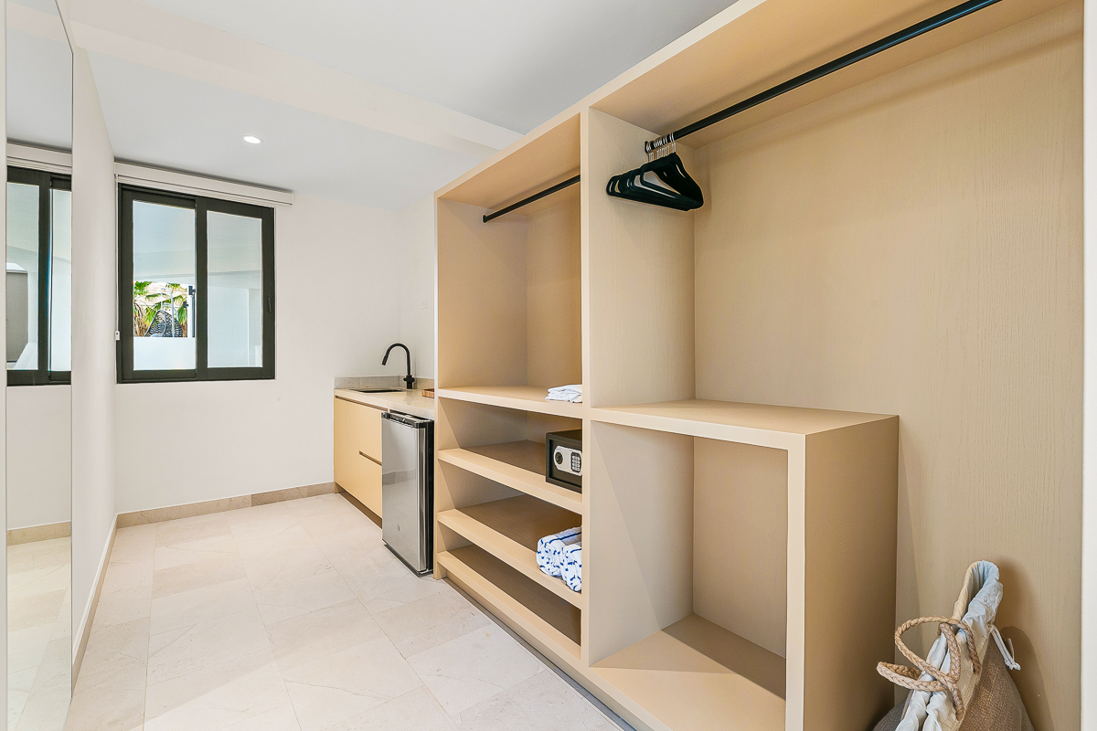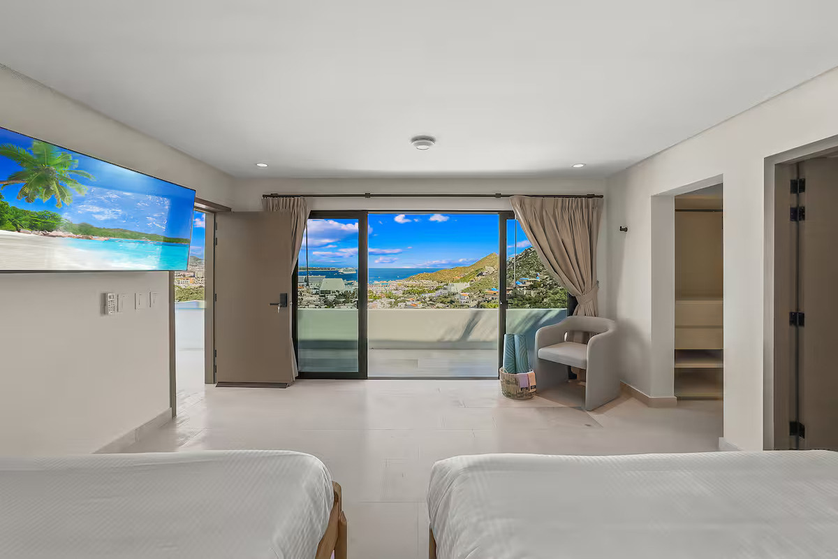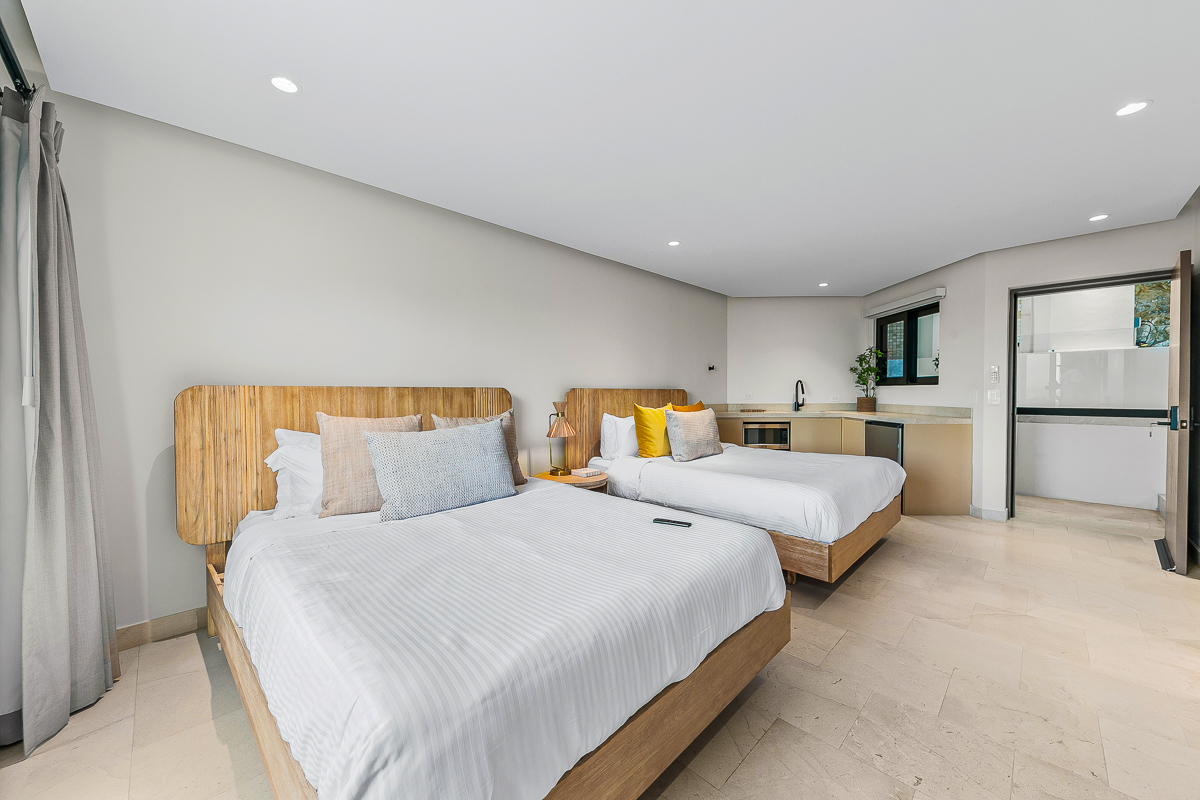 2 Queen beds, kitchenette, full bathroom, walk in closet, balcony, TV and sitting area